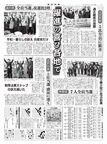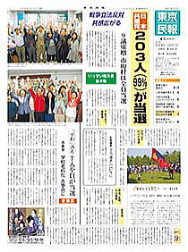 • 躍進の喜び各地で 八王子市 5氏全員に歓喜 過去最高の得票/中野区 7人全員当選 得票で第2党に並ぶ前進/品川区 全員当選、改選比2増 平和・暮らしの訴え 共産党だけ/江戸川区 上位当選 感涙に湧く 戦争法案ストップの訴え届いた