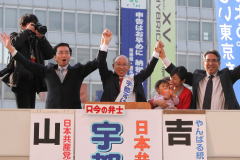 聴衆の声援に応える(左から)山下芳生、宇都宮候補、(一人置いて)吉田の各氏