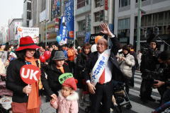 激しく追い上げる宇都宮けんじ候補。ベビーカー大行進で