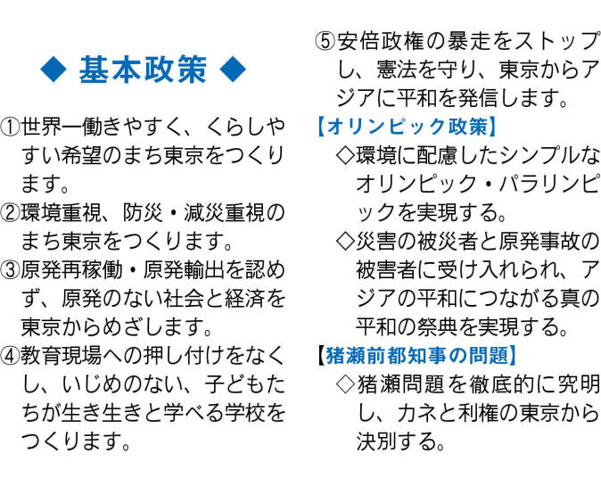 また五輪開催は「東日本大震災の被災者や原発事故の被害者の人々にも歓迎されなければならない」とし、被災者・被害者の生活再建と原発事故の早期収束を求めるとしました。さらにシンプルで環境に配慮した五輪にする必要があるとし、巨大すぎるとの批判がある新国立競技場(新宿区)や環境破壊が心配される葛西臨海公園(江戸川区)へのカヌー(スラローム)競技会場の建設計画などは見直すとしました。