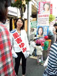 世田谷選挙区は、自民、民主、公明、維新、みんな、ネット、社民、無所属など定数8を有力15人が争う激戦区です。里吉さんは、区議会議員3期10年の実績を持つ子育て真最中の母親。深刻な保育所待機児の現状に触れ、「オール与党の都議会が、都民の願いの実現を阻んでいる」と訴えています。