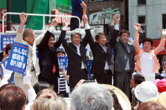 支援する4野党、生活者ネットの代表とともに声援に応える鳥越氏(左から3人目)