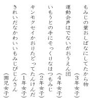 先生役の中村さんは「この俳句は皆さんの先輩が作った句」と紹介し、この句をもとに、俳句を作るには、『3つの約束』があると話します。・五・七・五の17字でリズムよくまとめる・季語を入れる・俳句は短い詩。心に強く感じたこと(感動)を句にする―の3点を説明。秋の季語には、どんなものがあるかを丁寧に紹介したあと、「では、お庭で季語を探し、俳句を作ってみましょう」と呼びかけました。
