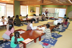 毎月1回開く子どもの句会の会場は、同館2階の30畳敷きの大広間。10月の句会には、学童・園児17人が参加しました。