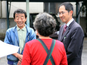 放射線量の公表直後、宿泊客からキャンセルがあった旅館の経営者は、日本共産党の島崎利雄町議(写真・左端)とみねざき拓実氏(同党奥多摩町民運動部長、町議選予定候補。写真・右端)に、こう訴えました。
