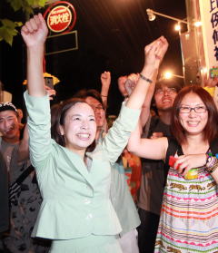 当選を勝手連の人たちとともに喜ぶ吉良よし子候補