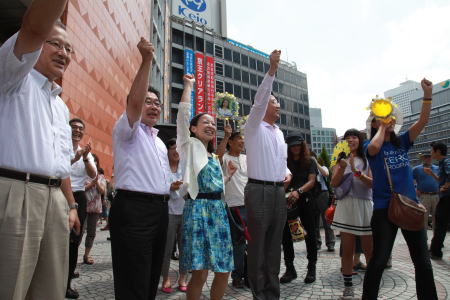 演説終了後、聴衆からコールが湧き起こり、吉良、小池、山下各氏も輪に入って「政治を変えるぞ吉良よし子、共産党の吉良よし子」の唱和を盛夏の空に響かせました。