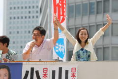 参院選投開票から一夜明けた22日、東京選挙区で初当選の吉良よし子さん、3年ぶりに比例代表で議席回復を果たした小池晃・日本共産党副委員長は午後0時半、新宿駅西口でそろってマイクを握りました。比例で当選した山下芳生同党書記局長代行=現=も駆けつけました。人垣が広がり「頑張れ」「おめでとう」の声援が飛びました。