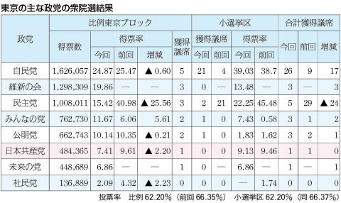 大敗した民主党は、東京でも比例で前回(09年)より得票率を25以上減らし、小選挙区と合わせ24議席を失いました。一方、自民党は4割の得票なのに8割の議席を占めました。東京でも小選挙区では得票率39・03%(前回比0・33増)なのに議席は4から21議席に増やし、議席占有は8割で、現選挙制度のゆがみが浮き彫りになりました。